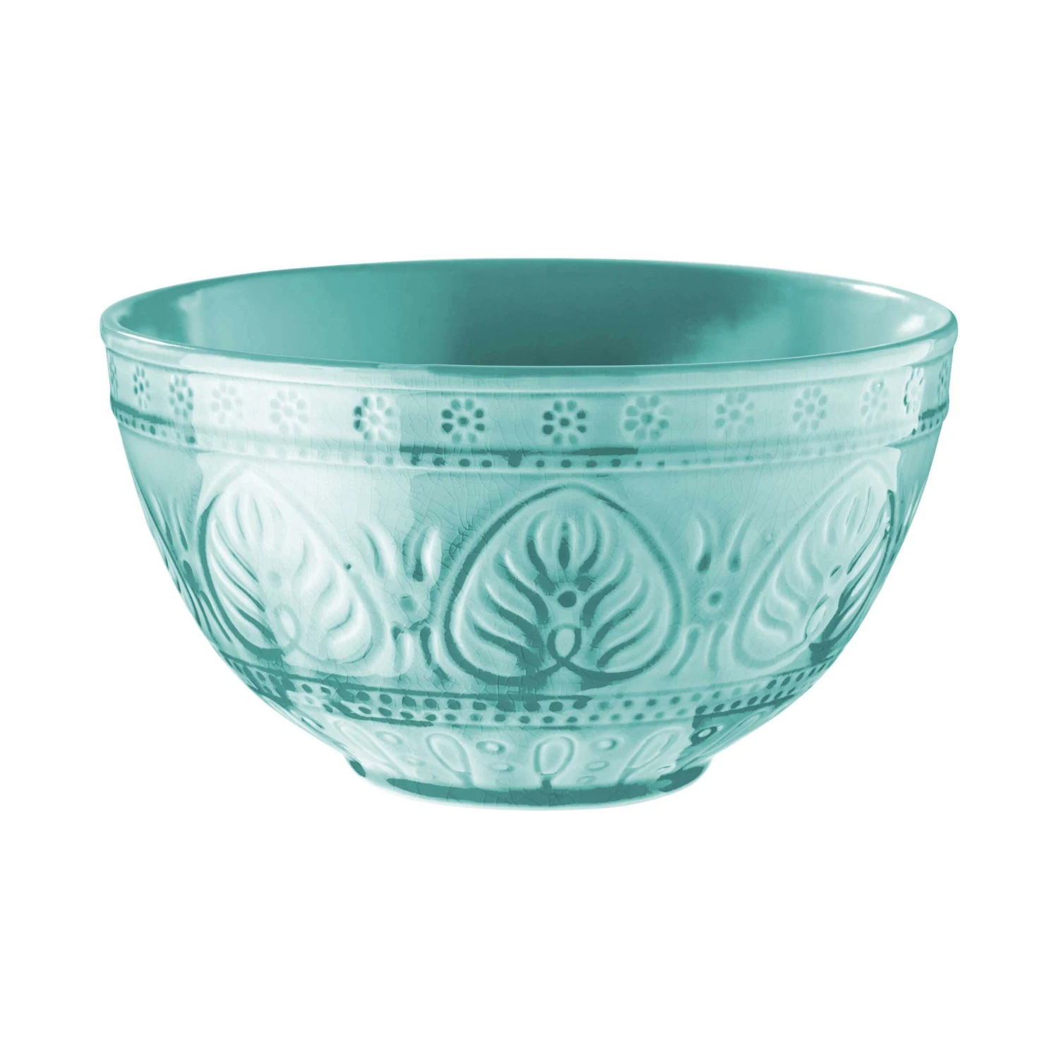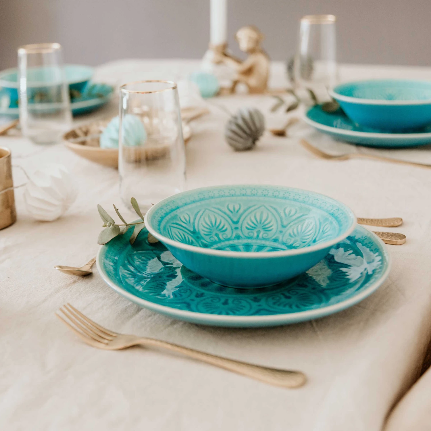 Jedes Teil des 12-teiligen Geschirrsets aus Steinzeug, bestehend aus Speisetellern, kleinen Tellern und Suppenschalen, die effektvoll glänzende Glasur in exotischen Farben (innen eher matt) unterstreicht die kostbare Optik. Was für ein sanfter Kontrast zu den sehr scharf gewürzten Speisen, die man in Padang und ganz Sumatra traditionell reicht.