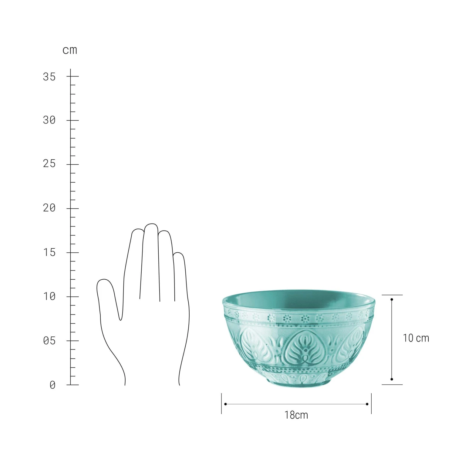 Teller: Ø 25 cm, Höhe 3 cm, Teller: Ø 21 cm, Höhe 2,5 cm, Suppenschale: Ø 18 cm, Höhe 10 cm, Füllmenge: 1250 ml