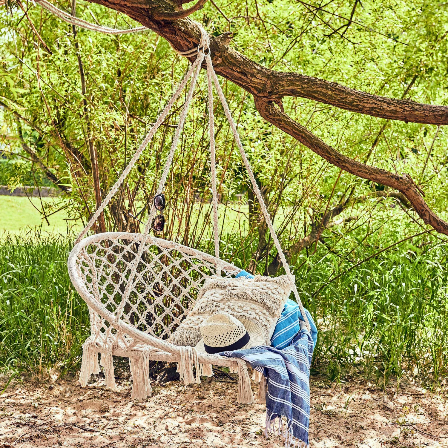 – Der Sitz zum Aufhängen ist aus heller Baumwolle, Polyester und Stahl.